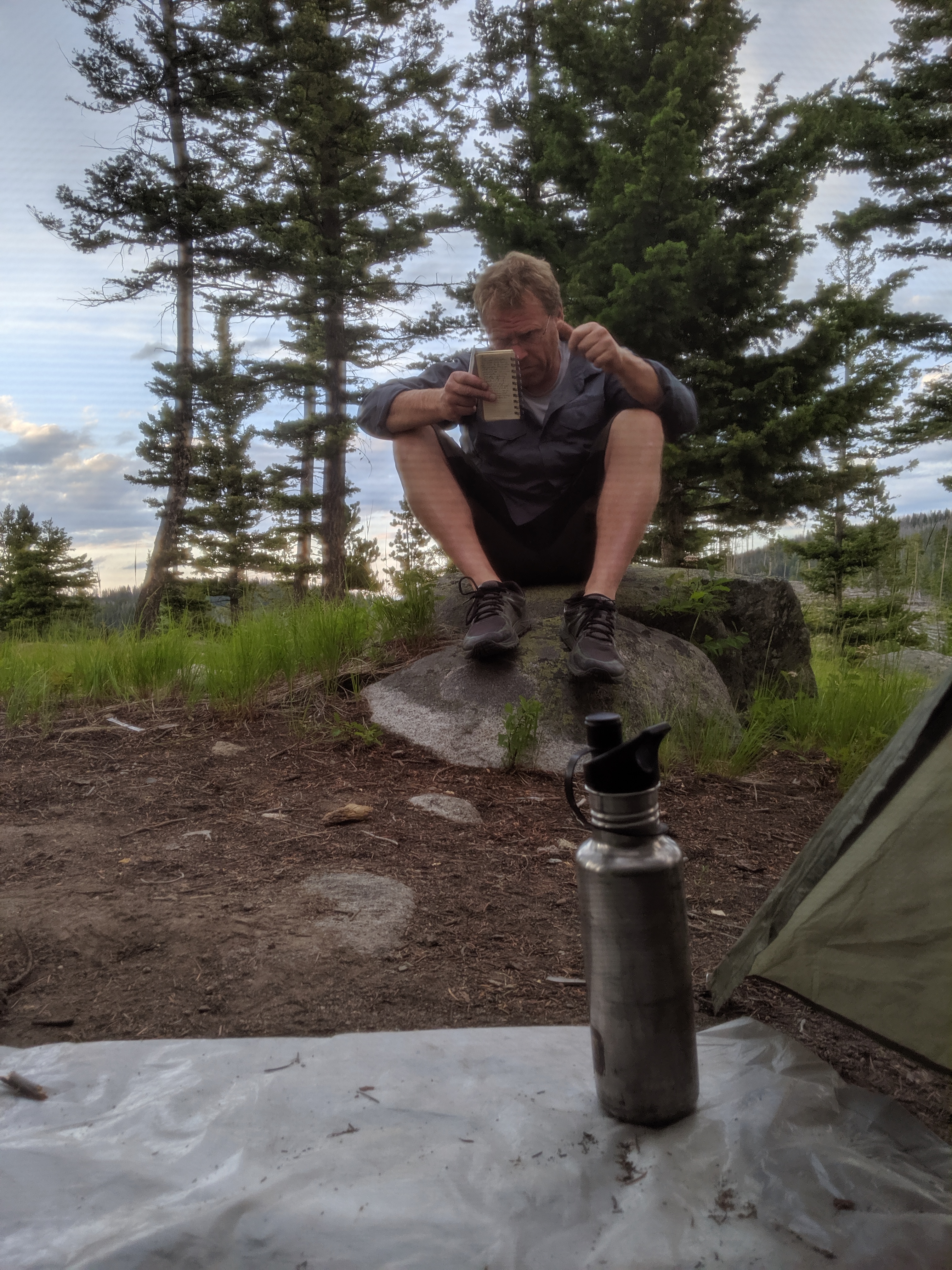We ended up camping at a great site called Park Lake. Quite a few people were there kayaking in the lake, some group filming something or other, and our particular site was awesome. Since we ended a bit early for the day, Marty cooked up one of our dehydrated meals of Pad Thai (good but spicy). I set up camp (on a slight slope that caused me to constantly fight not to roll into Marty all night), I figured out how to finally use our sleeping bag (this is the one I left in WA that Mom and Dad brought to us). The sleeping bag was/is awesome!! There’s a sleeve to keep our thermarests together and it’s just warm and super cozy!