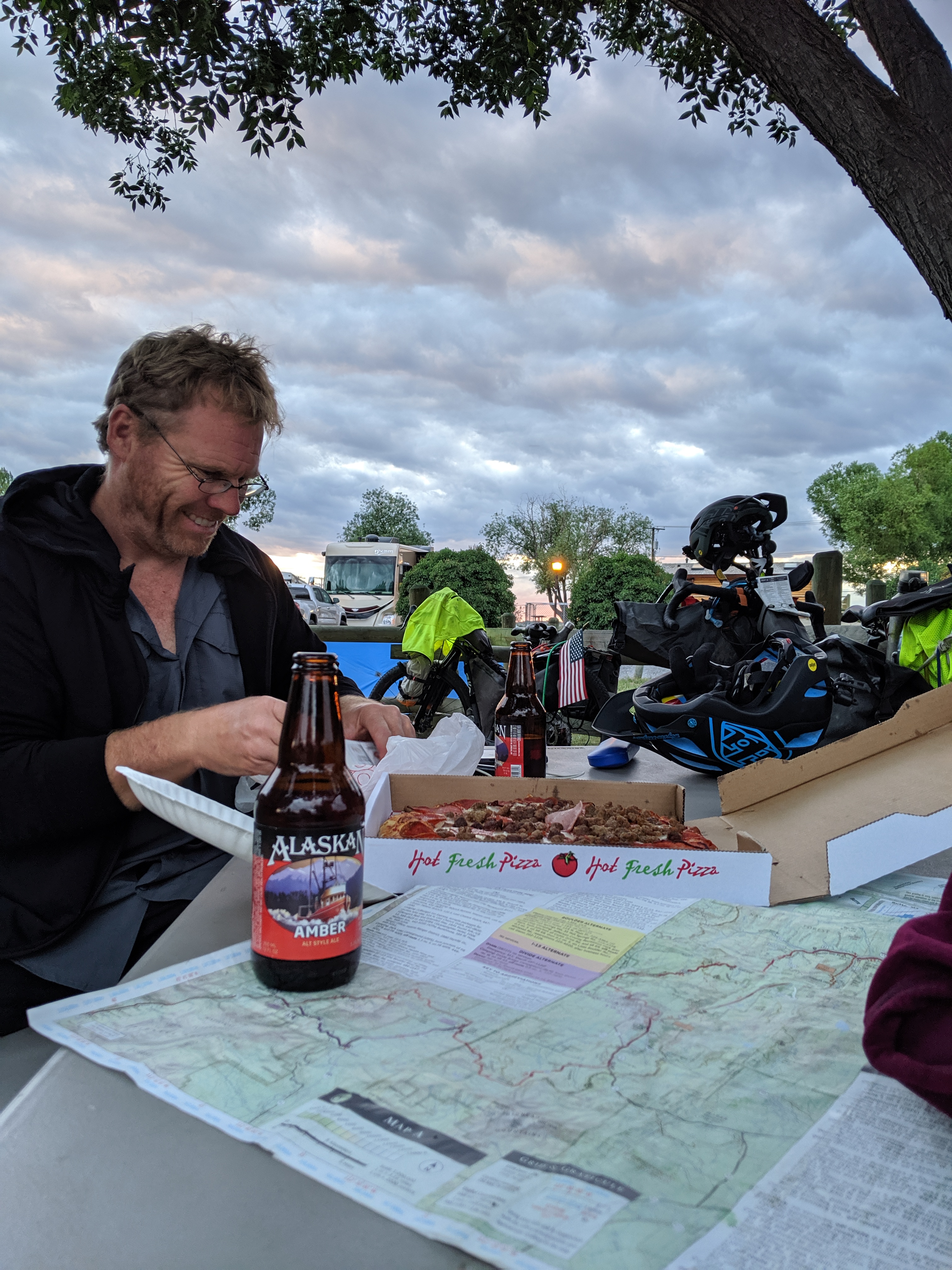 After lunch in Basin, we then ride to Butte. All in all about 56 miles. So we were feeling pretty good. We camped at a KOA which was heavenly!! We got a little discount since we were doing the ride and had free showers. We even had pizza delivered and bought two beers from the little store. The next morning, Marty peddled to Safeway and bought bacon and eggs and made us a decent little scramble with his little camping stove.
