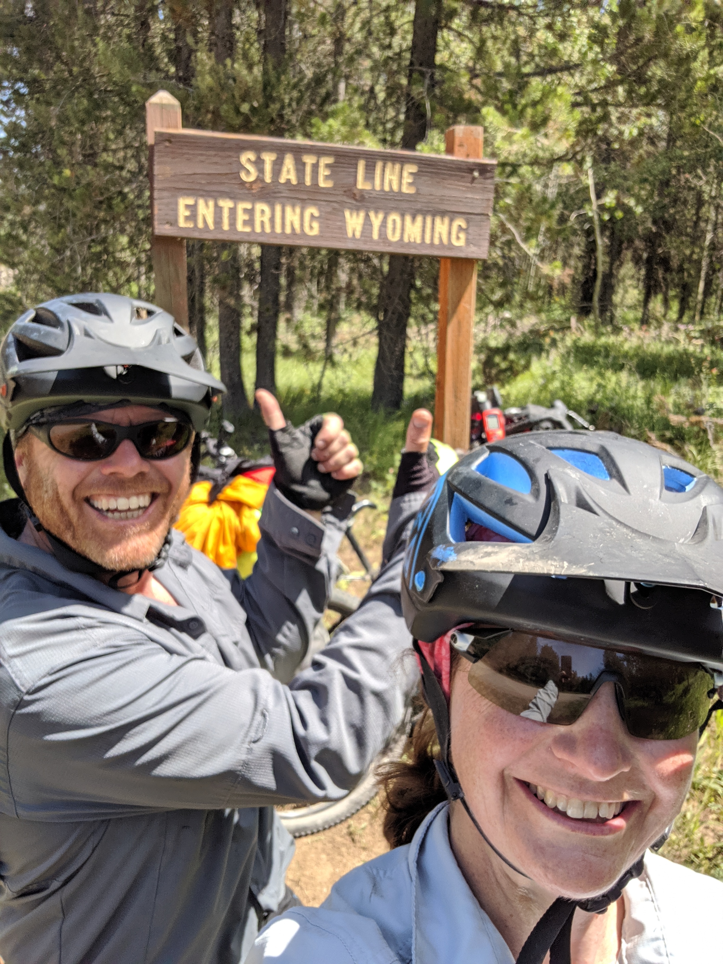 Instead we began our next day pedaling uphill for a few miles and got into Wyoming. We stopped at the Squirrel Lodge after about 10 miles to use the bathroom. We were greeted by an excited German Shepherd. Dogs have been so great on our trip, maybe because we’re so salty. Anyway, the maintenance guy came to greet us and ended up making us a cheeseburger and fries and cups of coffee. Really nice guy who also gave us some insect spray for the pass we were about to do. Shortly after we left, we got our first glimpses of the Tetons!! WOW!!!