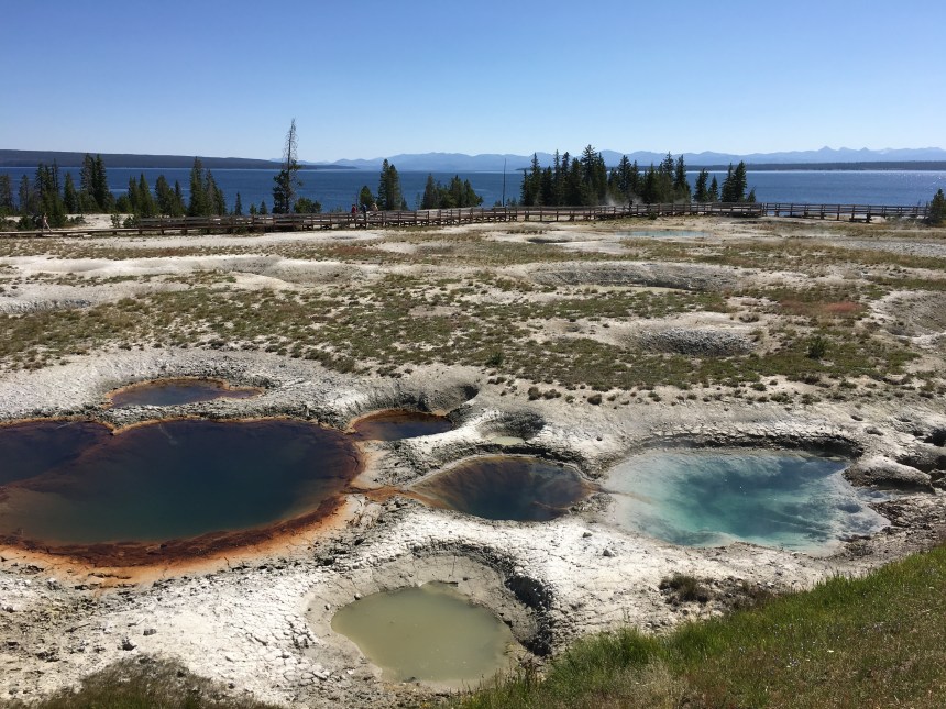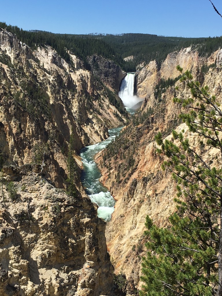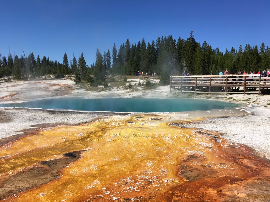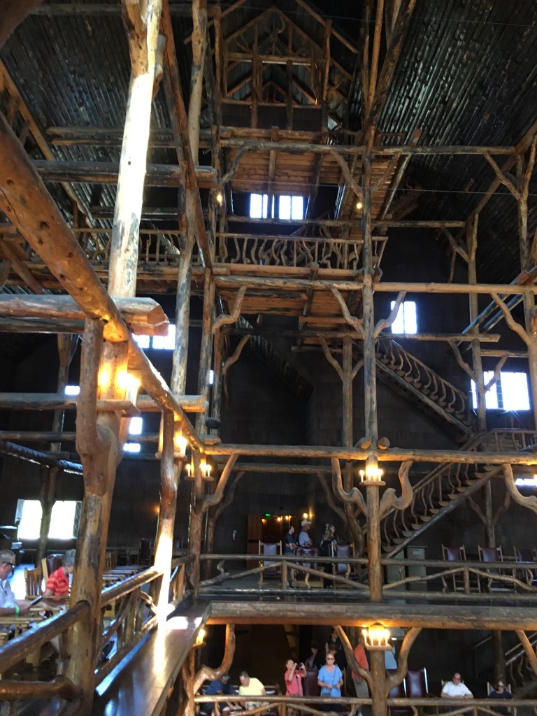 Yellowstone was awesome! Even though it was an 11 hour bus tour (ahhhhh!!!!), we saw buffalo, elk, geysers, mudpots, painted valley, waterfalls, Old Faithful Inn, and enjoyed a plastic cup of white wine on the balcony while watching Old Faithful do it’s spouting thing. It was a great day even if it was tiring :). We got back to camp, had dinner, and went to camp where I promptly went to sleep and Marty ran into Scottie Jim :).