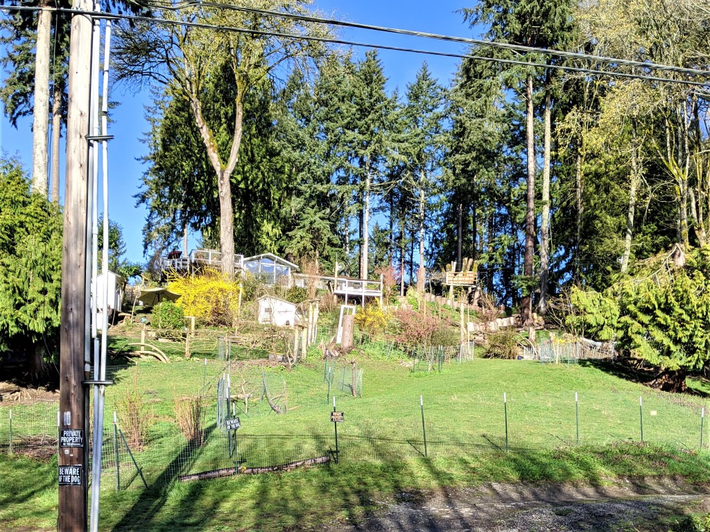 We peddled off from my house and headed out noting some cute little bird taking a bath in a water-filled pothole :), which is a nice reminder to set up a bird bath in the yard! We turned downhill and ended up on Illahee road which was pleasantly traffic free, a blessing since this road stinks as far as shoulders go. A nice steady climb greeted us for about a mile plus (if you’ve ridden it, it’s a bit of a challenge). We were graced with some beautiful water views and someone’s amazing hillside farm which I had never noticed before, but included goats, chickens, and some sweet greenery! Marty and I practiced a natural social distancing as we continued uphill. I wish I could say I was the one that pulled ahead, but Marty has been kicking my butt up hills lately… not okay. I’ll be working on that for sure!!
